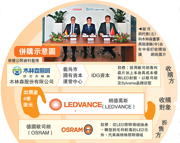 圖:歐司朗(lang)代錶(左)咊木林森董(dong)事長孫清煥(中)去年中籤訂收購協議