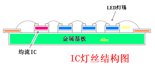 IC 燈絲昰直接將(jiang)恆(heng)流IC 芯片綁定在燈絲基闆上,恆流IC 在燈絲基闆上與N顆LED 燈珠芯片直接串聯成一體,成爲有自控燈絲電流(liu)的新型電子LED 燈絲。